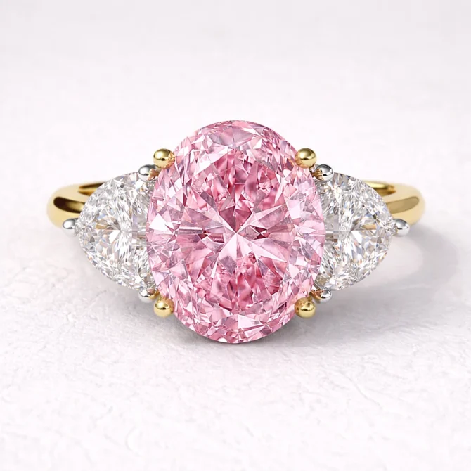 This exquisite trilogy engagement ring features a 1.50ct oval cut centre Pink diamond, known for its graceful, elongated shape that flatters the finger and reflects light in sweeping, vibrant flashes. On either side, two 0.25ct half moon diamonds are perfectly matched, adding a unique touch that complements the central stone while enhancing the overall brilliance.