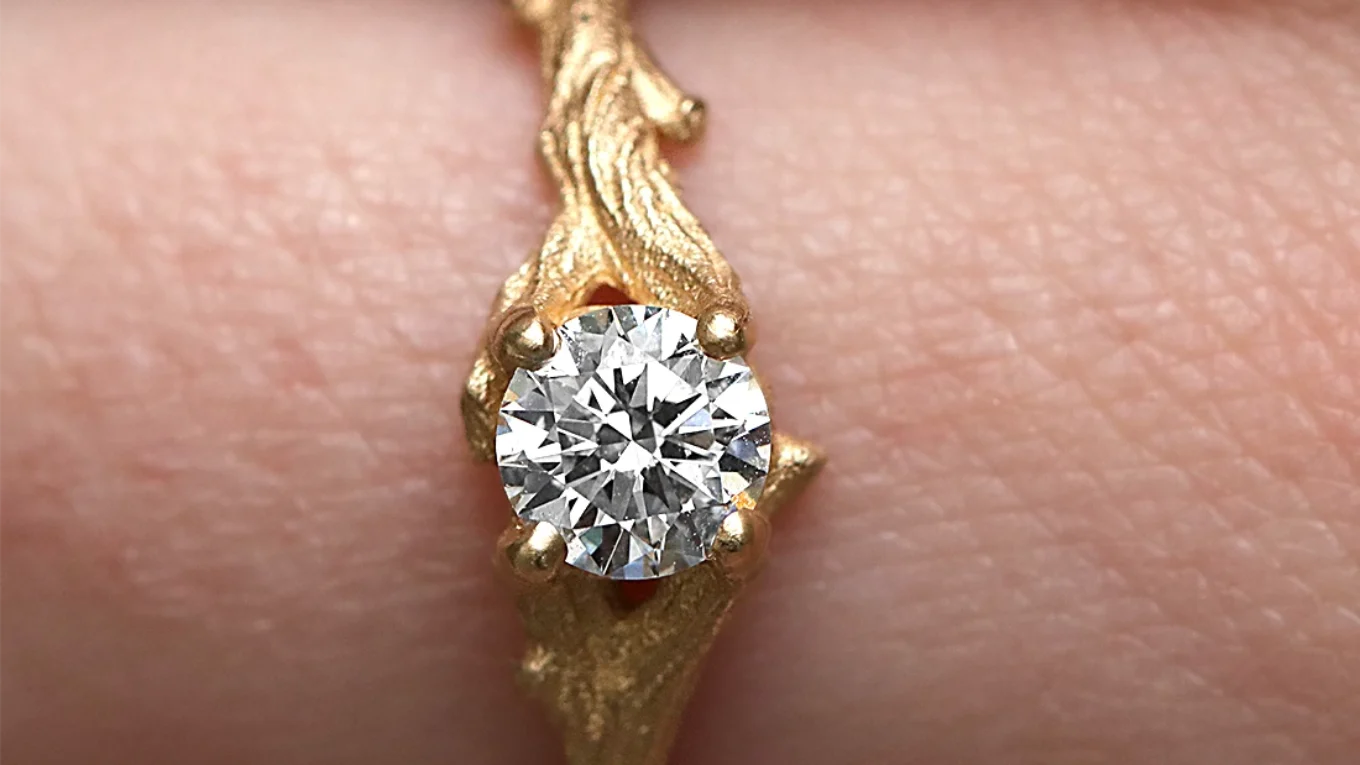 A round brilliant diamond rests within an oak-inspired band, its naturalistic texture evoking woodland beauty. The secure claw setting ensures lasting wearability while highlighting the stone’s brilliance.