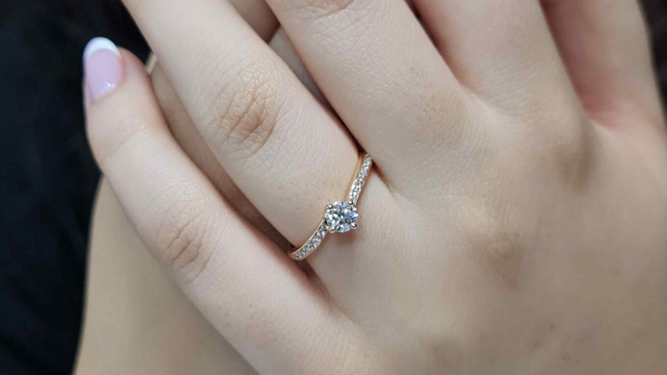 Slightly twisting towards the central stone are pave-set side diamonds with a combined weight of 0.10ct, adding balance, sparkle, and sophistication to the design. The result is a harmonious composition where the centre diamond shines with prominence, beautifully complemented by the radiance of the side stones.