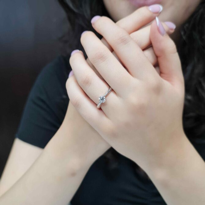A 0.50ct round brilliant diamond, accented by 0.15ct pavé set diamonds that flow into a modern twisted band. The four-claw setting securely holds the centre stone, while the graceful twist symbolizes unity and continuity, enhancing the overall sparkle.