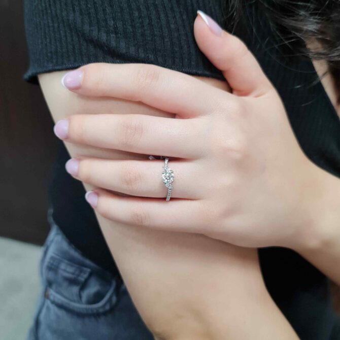 Claw-set round diamonds extend along the band, adding extra shimmer and visual interest. These carefully placed side stones elevate the overall brilliance and bring a refined balance to the piece.