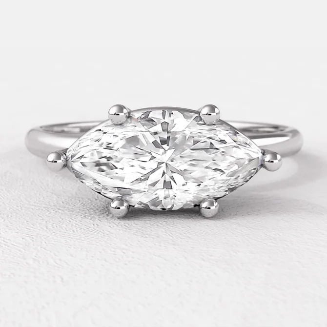 This elegant engagement ring reimagines the classic marquise solitaire with a modern twist. The 0.85ct marquise cut diamond is set horizontally (east-west) across the band, creating a chic, contemporary silhouette that flatters the finger.