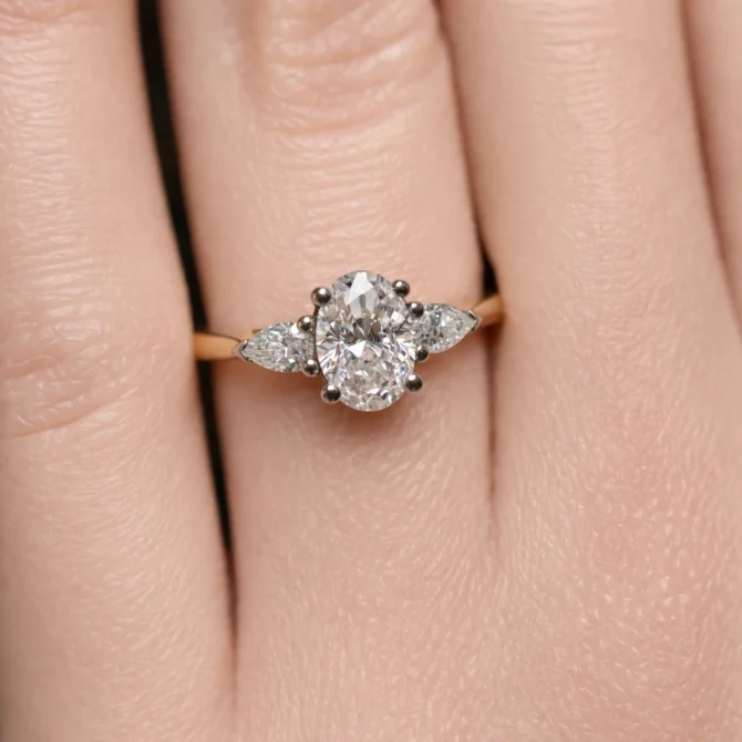 This design centres on a 0.90ct oval cut diamond, chosen for its elongated silhouette and lively flashes of light that flatter the finger. Either side, tapered pear-shaped diamonds curve gently towards the centre, drawing the eye inward and amplifying the stone’s fire.