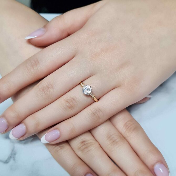 This beautiful side stone engagement ring features a 0.80ct round brilliant centre diamond, known for its exceptional sparkle and timeless appeal. The diamond is set in a 6-prong setting, with heart detailing that allows maximum light exposure, enhancing the diamond’s brilliance and ensuring its secure placement.