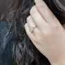 On either side, two 0.15ct trillion cut diamonds form a balanced trio. Their sharp triangular shape contrasts beautifully with the centre stone’s rectangular outline, reflecting light in bright flashes that heighten the ring’s brilliance. Together, the composition creates a harmonious balance of geometry, light, and colour.