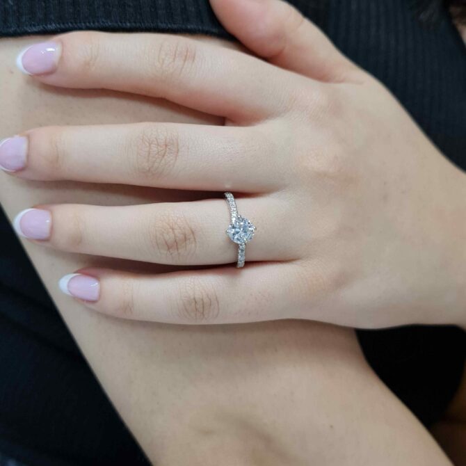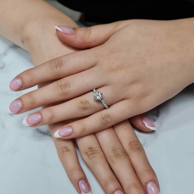 Flanking the central stone are claw-set side diamonds with a combined weight of 0.30ct, adding balance, sparkle, and sophistication to the design. The result is a harmonious composition where the centre diamond shines with prominence, beautifully complemented by the radiance of the side stones.