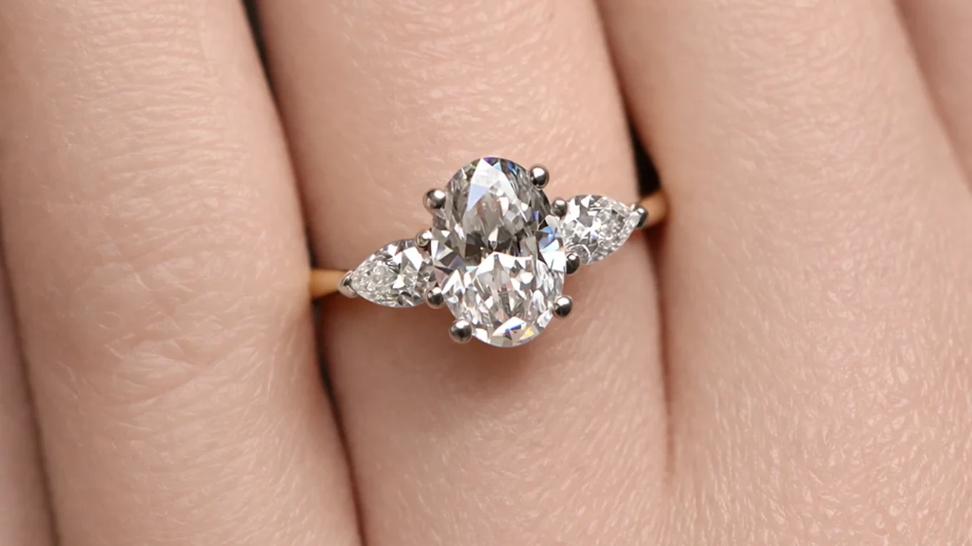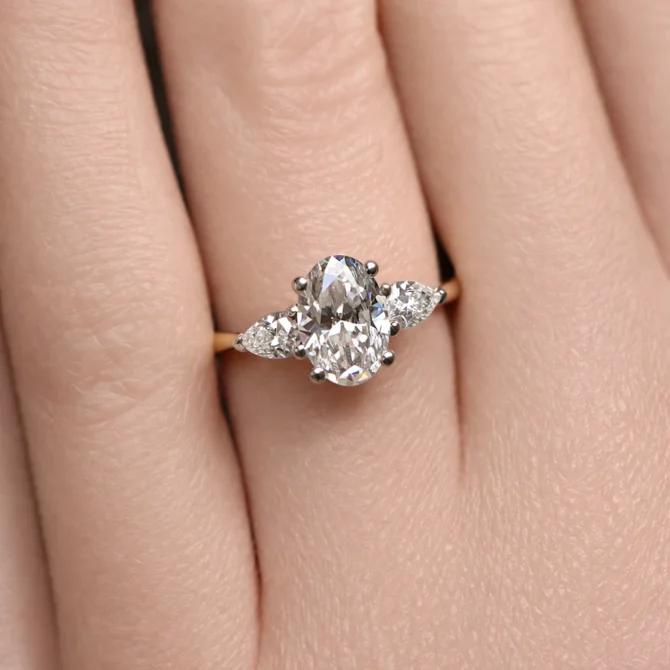 The centre of this ring features an elongated oval diamond, celebrated for its flattering silhouette and broad flashes of brilliance. On each side, a perfectly matched pear-shaped diamond tapers the design, guiding the eye toward the central stone while adding directional sparkle.