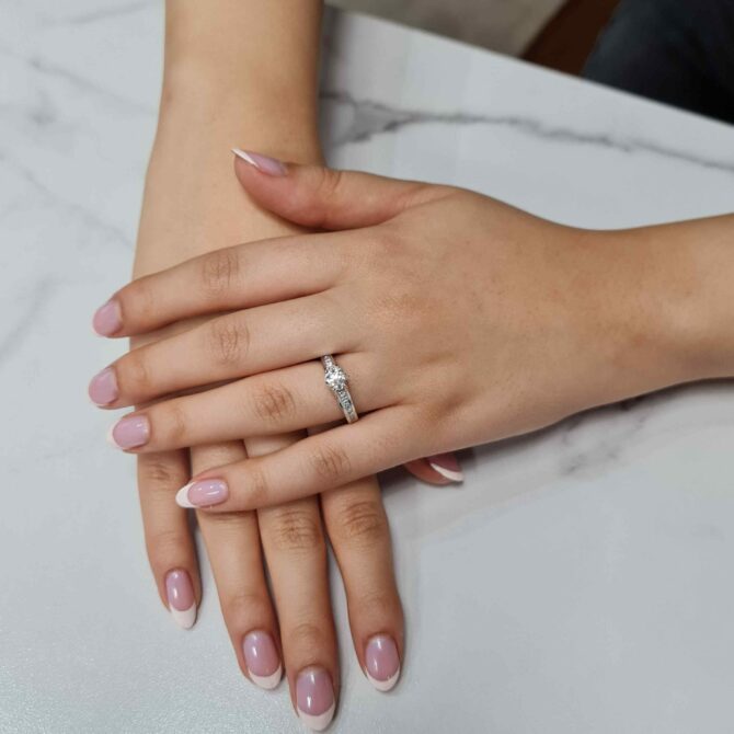 This design centres on a 0.71ct round brilliant diamond, carefully positioned in a four-claw mount to maximise sparkle and balance. The round cut offers unrivalled symmetry and light return, producing bright flashes of fire and brilliance.