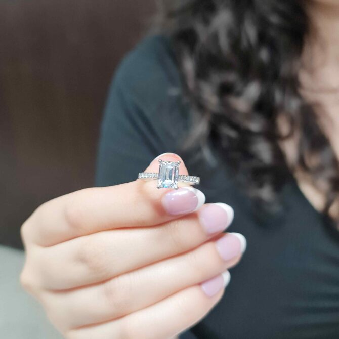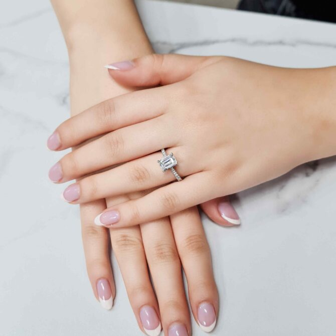 A 1.50ct emerald-cut diamond shines in a cathedral-style setting, with pavé diamonds along the band. Its clean lines, open design, and elevated profile create a timeless, elegant sparkle.