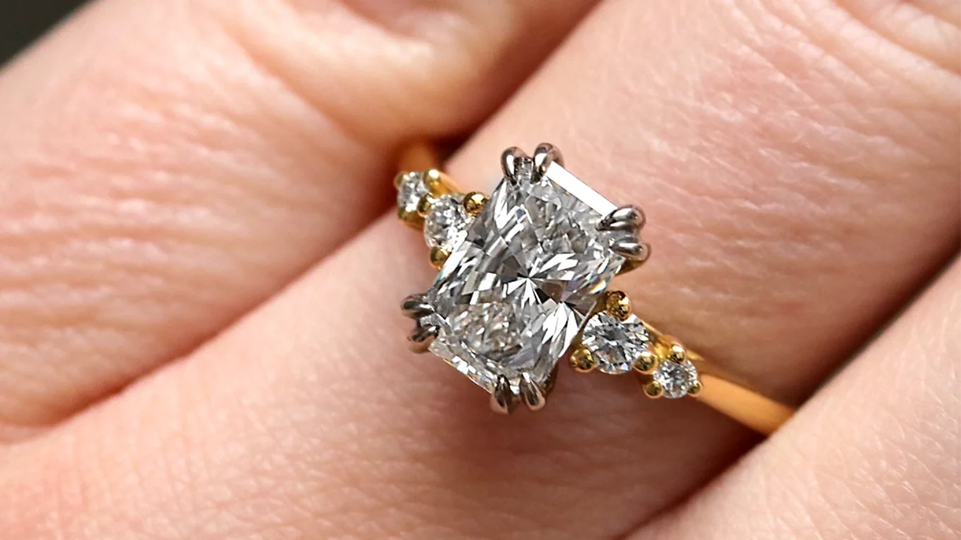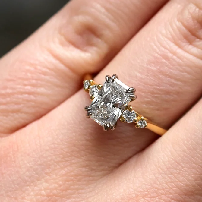 This striking engagement ring is defined by its 1.55ct radiant cut diamond, admired for its crisp rectangular outline and brilliant faceting that throws bold flashes of light. The centre stone is held in place by elegant double talon claws, adding both refinement and strength while allowing maximum light flow.