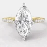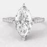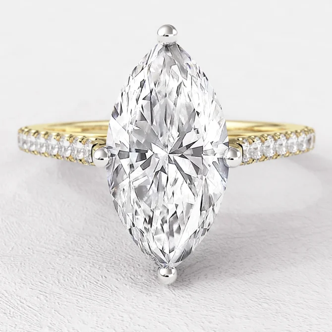 Flanking the center stone are tapered claw set side stones that gracefully extend along the shoulders of the band. These side diamonds are carefully selected and positioned to complement the marquise shape, adding extra brilliance and enhancing the overall sparkle of the ring without overpowering the centerpiece.