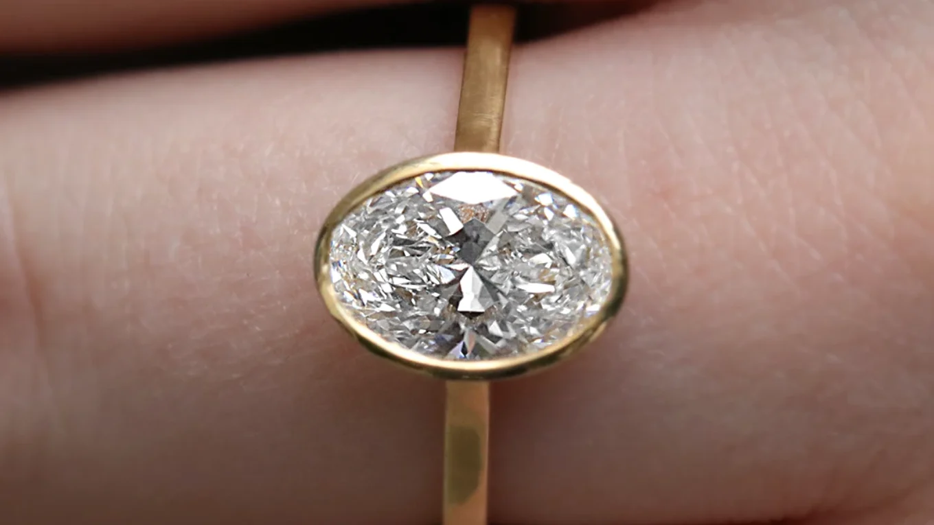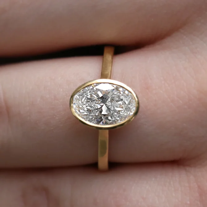 The centrepiece of this design is a 1.80ct oval diamond, admired for its elongated silhouette that flatters the finger and produces broad, lively flashes of light. Set within a full bezel of polished yellow gold, the diamond is securely encircled by metal, creating a sleek contemporary frame that enhances brilliance while offering lasting protection.