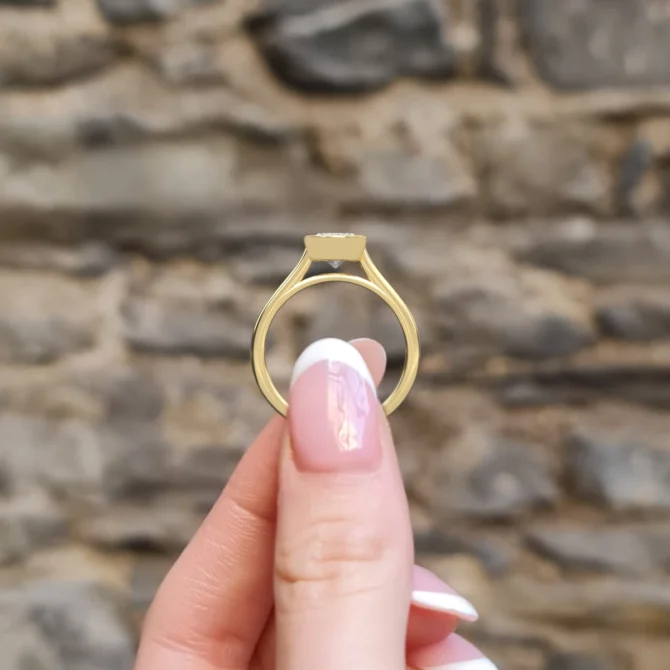 From the bezel, the design flows into a fine 2mm band, balancing strength with a delicate appearance. Its smooth, rounded form ensures everyday comfort, while the gallery remains open to allow light into the stone for added sparkle.