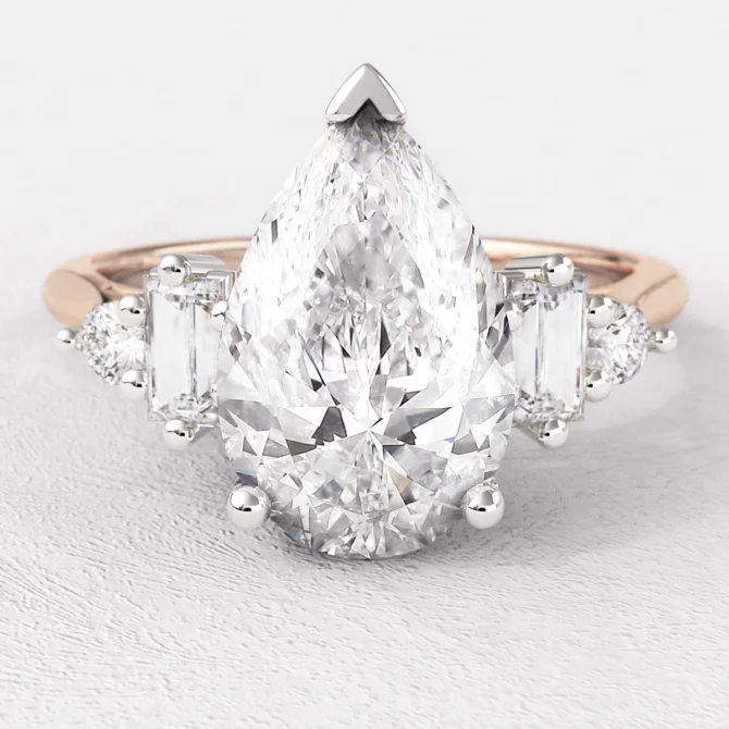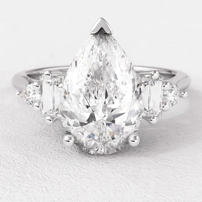 Total 1.85ct Pear Cut Diamond Side Stone Engagement Ring: This stunning ring features a certified 1.59ct Pear Cut diamond in D Colour & VS1 Clarity, complemented by baguette cut diamond and small diamond on each side.