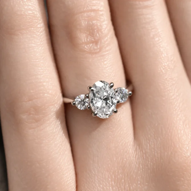 This trilogy engagement ring features a 1.50ct oval cut centre diamond, celebrated for its elongated form that flatters the finger and reflects light in broad, lively flashes. On either side, round diamonds add balance and sparkle, together symbolising past, present, and future.