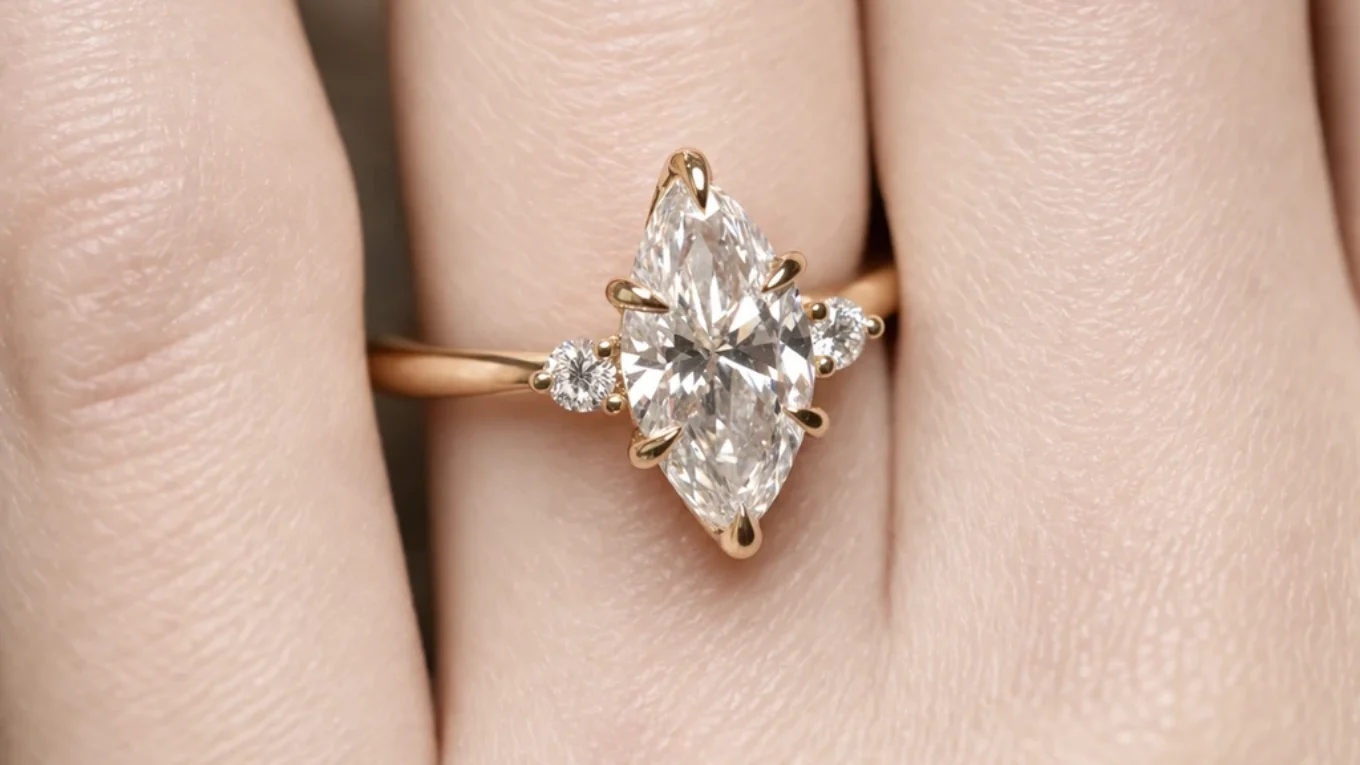 2.10ct Marquise Cut Three Stone Diamond Engagement Ring from Bespoke Diamonds. This timeless wonder features a certified 2.0ct D Colour & VS1 Clarity marquise-cut diamond as the centrepiece. The exquisite band setting in 18k yellow gold showcases additional side diamonds totaling 0.10ct, all hallmarked at Dublin Castle. Personalize this ring with your choice of 18k Yellow, 18k White Gold, 18k Rose Gold, or Platinum options.