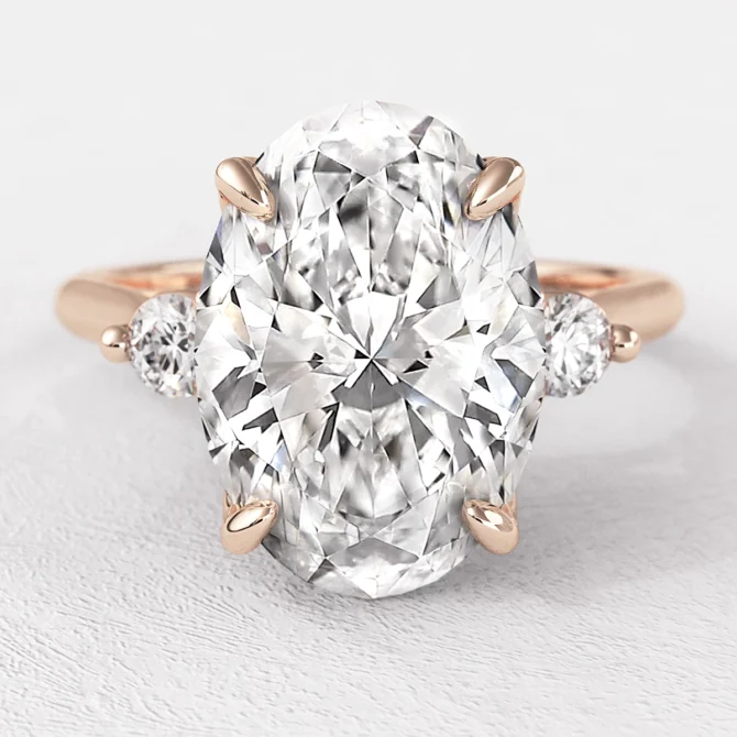 Two round brilliant diamonds of 0.05ct each sit on either side of the centre, adding balance and highlighting the oval’s sparkle. This harmonious trio of stones carries the classic trilogy meaning — representing past, present, and future — while creating a composition rich in light and proportion.