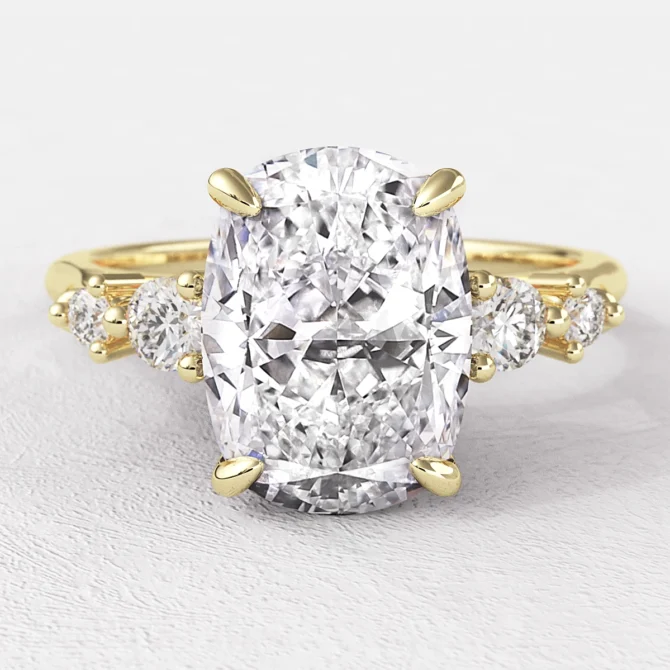 This stunning engagement ring features a 2.16ct elongated cushion cut centre diamond, prized for its soft, romantic shape and brilliant sparkle. The cushion cut combines rounded corners with large facets, offering a timeless, vintage-inspired elegance with modern radiance. The center diamond is securely held in a talon prong setting, which not only enhances the stone’s shape and brilliance but also provides added security and a distinctive, refined look.