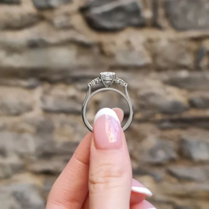 - Two graduating round brilliant side stones are set on each side of the centre diamond, designed to draw the eye into the centre diamond.