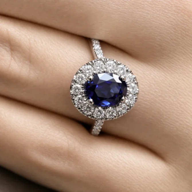 Lab grown 1.65ct oval shape sapphire set in a halo of 14 round cut lab grown diamonds set in platinum. Hand made in our Dublin workshop.