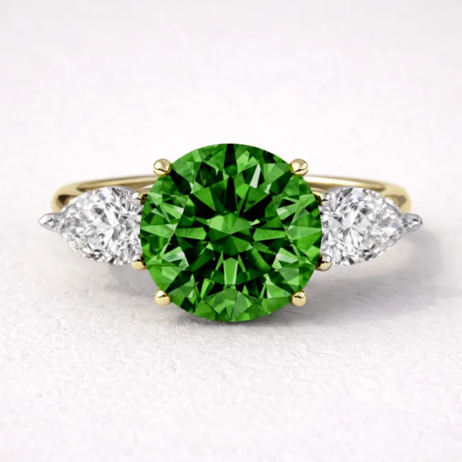 This three stone engagement ring features a 2.00ct round cut green diamond at its centre, prized for its perfect symmetry and exceptional light return. On either side, pear-cut diamonds taper elegantly towards the band, their directional brilliance guiding the eye back to the central stone.