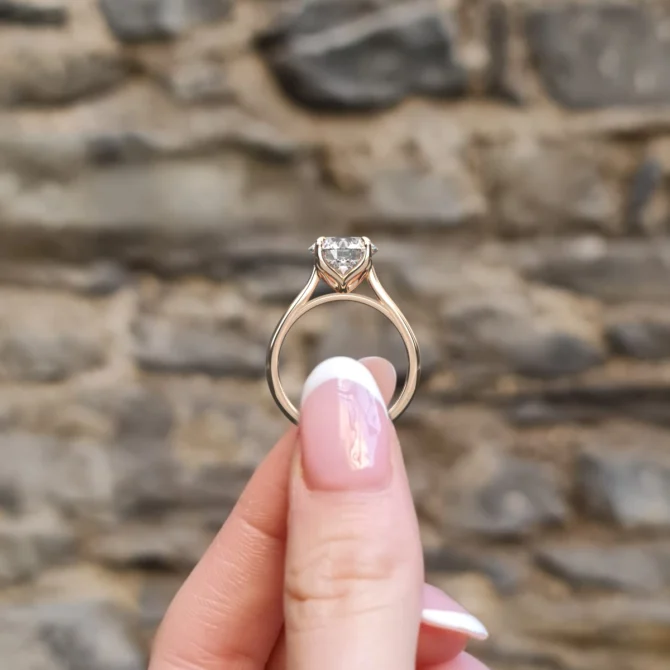 At the centre of this ring lies a 2.50ct Round diamond, prized lively directional sparkle. The diamond is secured by four protective claws, carefully placed to balance security with openness so the stone catches light from every angle.