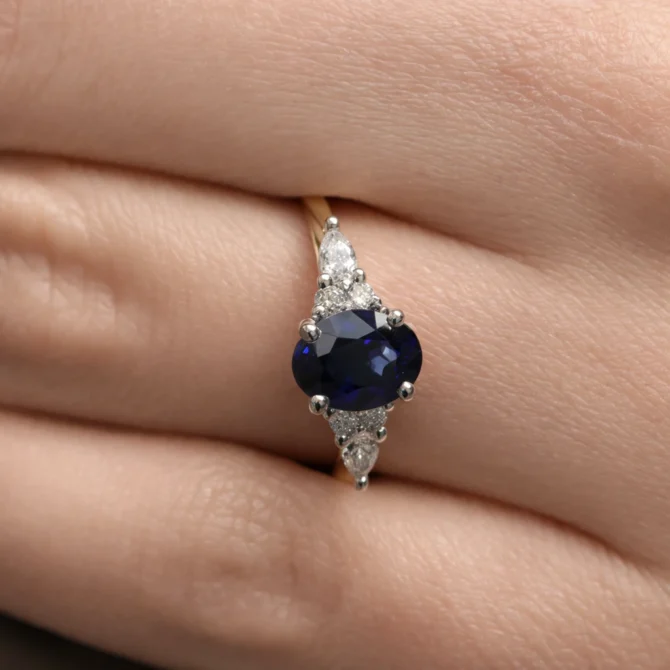 This ring is set in 18k yellow gold. This beautiful multi stone ring features a 2.25ct oval shape centre lab grown sapphire.