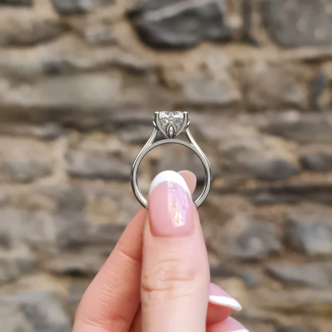 At the heart of this design sits a striking 3.00ct round brilliant diamond, cut to excellent proportions for maximum sparkle and fire. The stone is held in place by a graceful four-claw tulip setting, where delicate petal-like curves not only provide security but also lift the diamond to capture light from every angle.