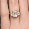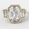 A 4.90ct trilogy ring with a 3.58ct emerald cut centre diamond, flanked by emerald cut side stones. Set in 18ct yellow gold, the clean besel setting enhances symmetry and geometric elegance.