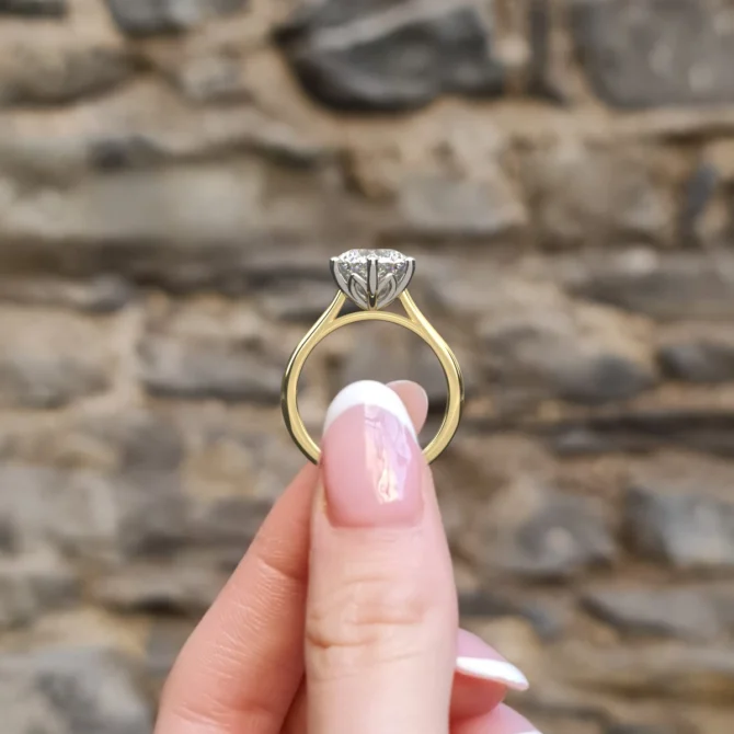This striking engagement ring centres on a 3.00ct round brilliant diamond, celebrated for its unmatched sparkle and balanced symmetry. The diamond is held securely in a tulip-style six-claw setting, with claws positioned at 6 and 12 o’clock for harmonious alignment. Inspired by the graceful curve of tulip petals, the setting adds a delicate floral character while enhancing both security and elegance.