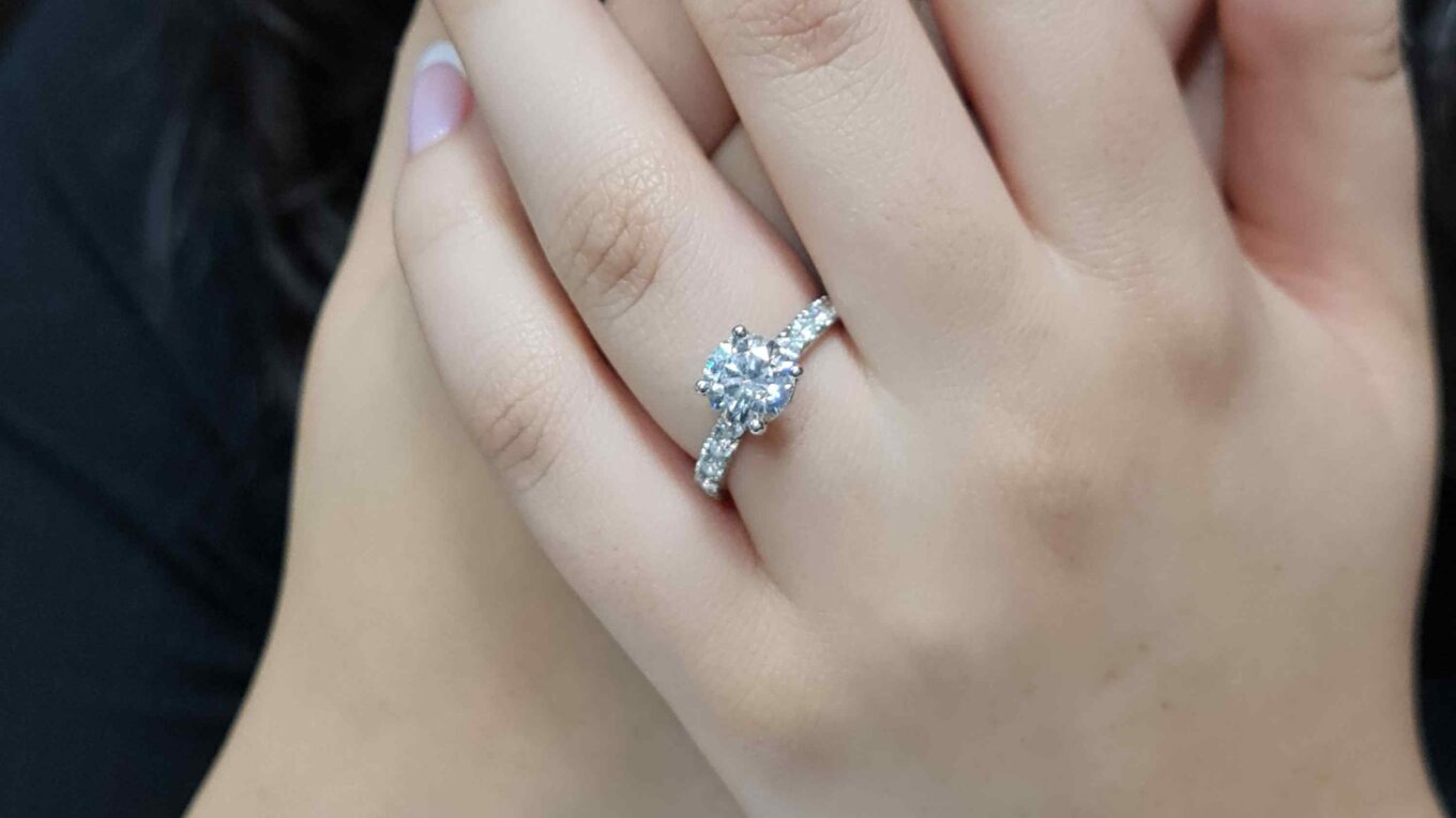 This classic engagement ring features a 1.50ct round brilliant centre diamond in a four-claw setting, complemented by 0.50ct of claw-set side stones for added sparkle