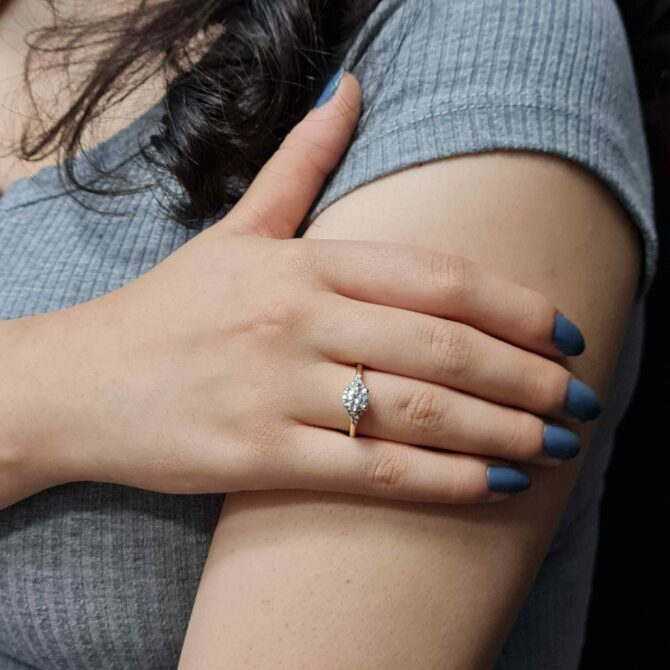 The band is crafted in 18ct gold, providing a sleek and durable foundation that enhances the overall design. With a 2mm refinded band, it ensures the center diamond remains the focal point while adding elegance to the silhouette.