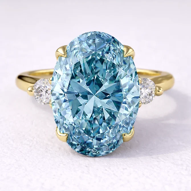 At the heart of this trilogy design rests a 2.00ct oval cut blue diamond, admired for its elongated form that flatters the finger and delivers broad, lively flashes of brilliance. The stone is secured by four refined claws, allowing light to flow freely while offering strength and stability.