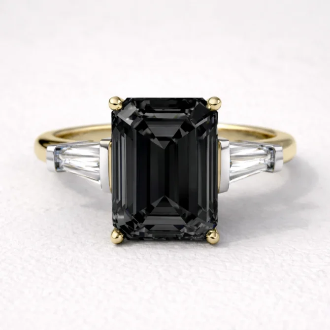 A 2.50ct emerald cut black diamond is complemented by tapered baguette side stones in this sleek three stone design. Crafted in 18ct white gold with a 4-claw setting, it delivers refined elegance with modern precision.