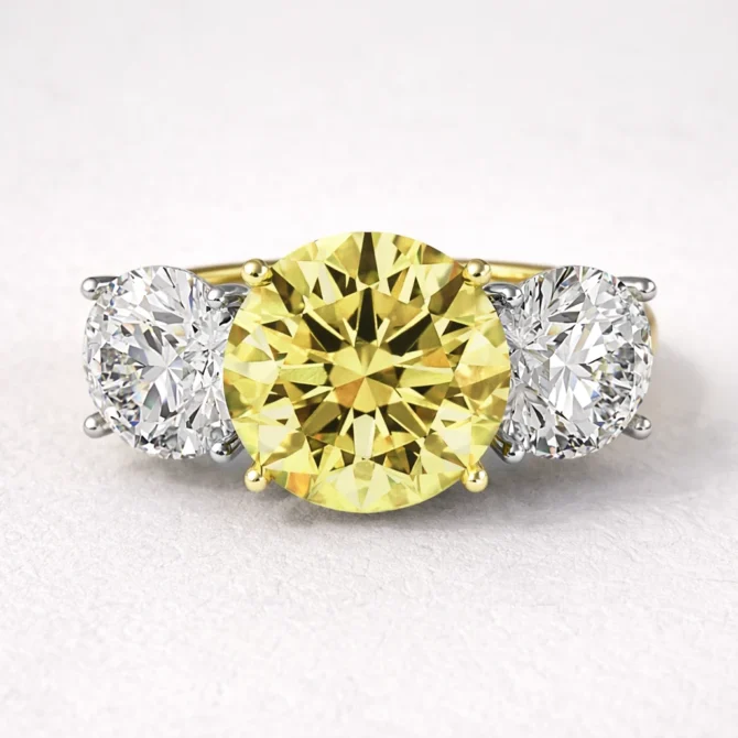 This timeless engagement ring features a central 2.00ct round brilliant yellow diamond. Two perfectly matched 0.80ct round diamonds sit on either side, enhancing the colour contract while symbolising past, present, and future.