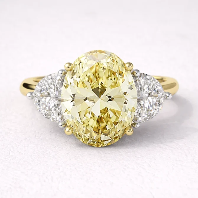 This exquisite trilogy engagement ring features a 1.50ct oval cut centre Yellow diamond, known for its graceful, elongated shape that flatters the finger and reflects light in sweeping, vibrant flashes. On either side, two 0.25ct half moon diamonds are perfectly matched, adding a unique touch that complements the central stone while enhancing the overall brilliance.
