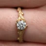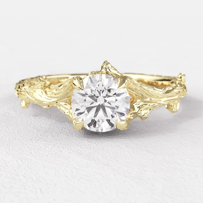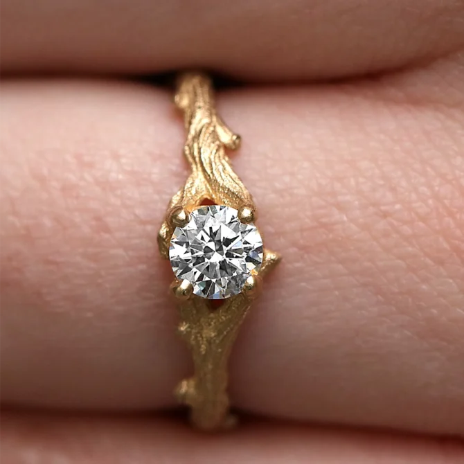 A 0.40ct round brilliant diamond rests within an oak-inspired band, its naturalistic texture evoking woodland beauty. The secure claw setting ensures lasting wearability while highlighting the stone’s brilliance.