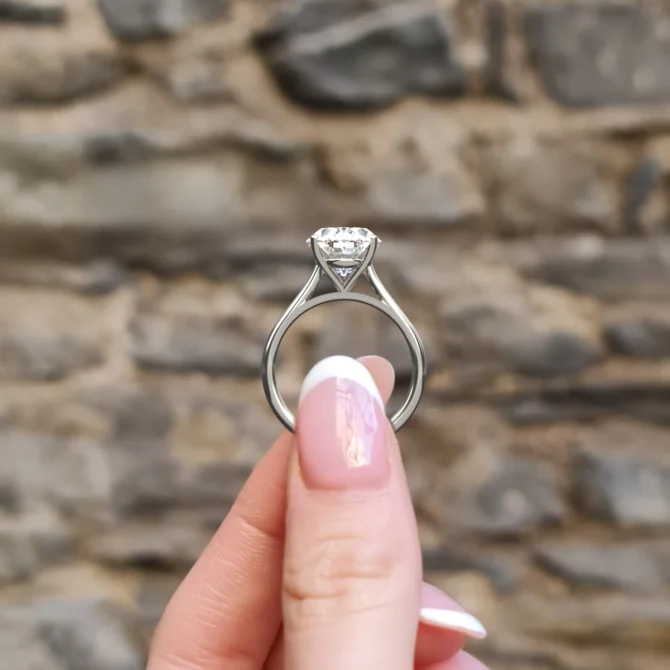 This elegant solitaire engagement ring showcases a stunning 4.04ct oval cut diamond, celebrated for its elongated shape that flatters the finger and enhances the stone’s brilliance. Cut to excellent standards, the oval diamond delivers exceptional fire and sparkle, making it a beautiful alternative to the classic round.