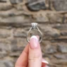 The diamond is securely held in a classic four-claw straight bar setting, allowing maximum light to pass through the stone for optimal brilliance. The cool 18ct white gold band complements the diamond’s crisp sparkle, adding a touch of timeless sophistication to the design.