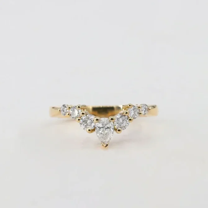 Set in 18k yellow gold, this amazing wedding ring has a total weight of 0.56cts. The band contains one pear cut and six round cut lab grown diamonds. All diamonds in D-F color and VS clarity.